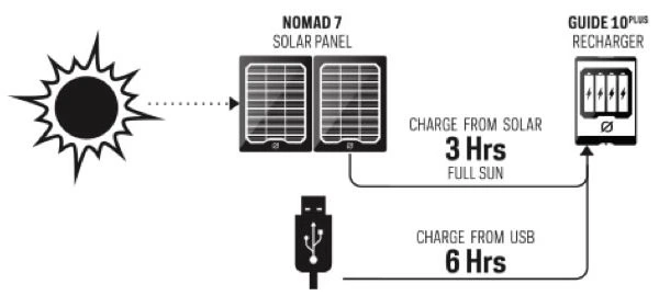 Con el recargador Guide 10 Plus y el panel solar Nomad 7 tiene un kit portátil sólido de carga para que lo acompañe en sus aventuras. Cargue baterías AA con energía solar o use cualquier puerto USB, luego encienda su teléfono, MP3, GPS o tablet en un santiamén.